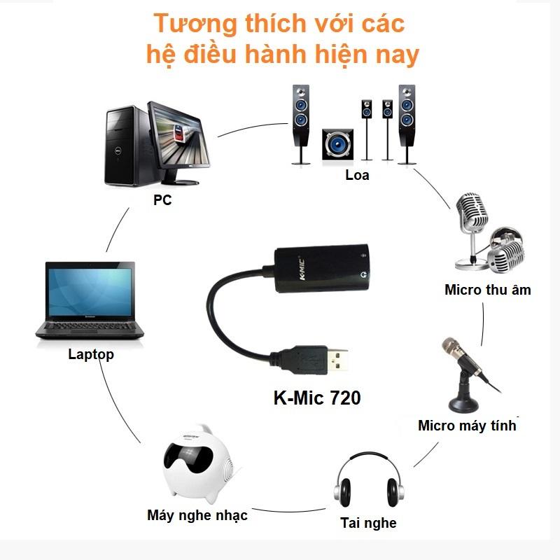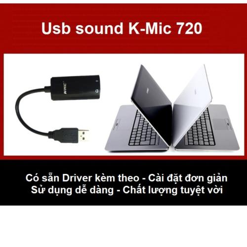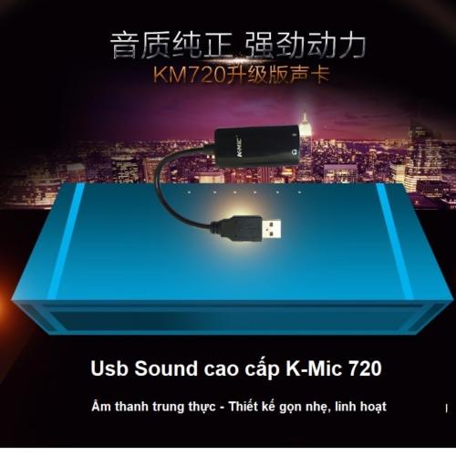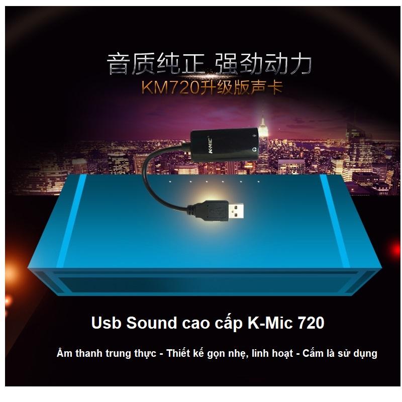 K-Mic KM720 là sound card usb gắn ngoài cho máy tính, laptop, sử dụng chip âm thanh của Creative cho chất lượng âm thanh tốt hơn hẳn sound onboar trên các dòng laptop giá rẻ. K-Mic KM720 sử dụng tốt với tai nghe hoặc loa máy tính để nghe nhạc, xem phim, chơi game hoặc kết nối micro máy tính để chat voice, skype, hát karaoke online, thu âm.